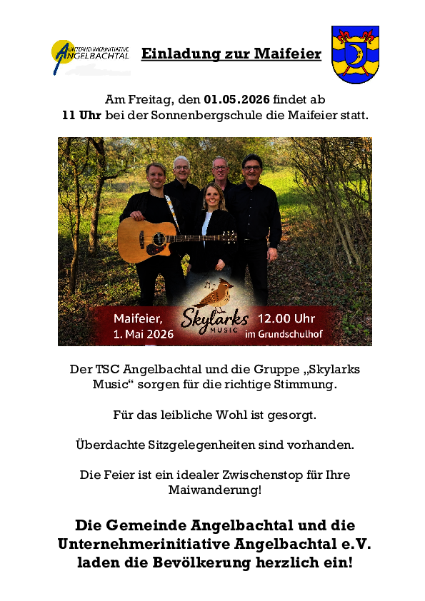 Am Freitag, den 01.05.2026 findet ab 11 Uhr bei der Sonnenbergschule die Maifeier statt.
