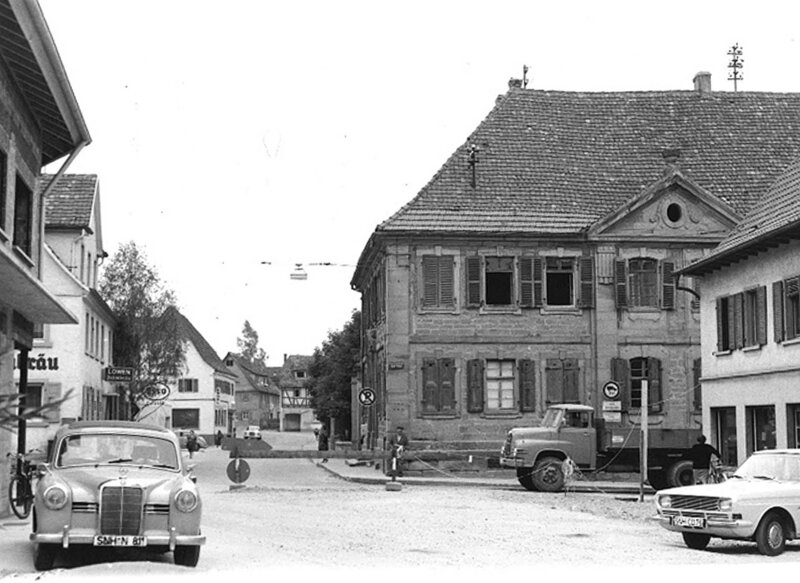 1969 hatte die Gemeinde das Schloss und den Schlossgarten sowie das nahegelegene Amtshaus erworben, hat Hauptamtsleiter Diethelm Brecht im Gemeindearchiv recherchiert. Das Amtshaus wurde bei der Modernisierung und dem Ausbau der Ortsdurchfahrt 1970 abgerissen. Die Raiffeisenbank Michelfeld erwarb das Areal neben der Kreuzung und erbaute Anfang der 1970er Jahre das Volksbankgebäude. Es wurde als eingeschossiges Flachdachgebäude mit teilweiser Aufstockung errichtet, im Obergeschoss wurde schon damals eine Arztpraxis eingerichtet.