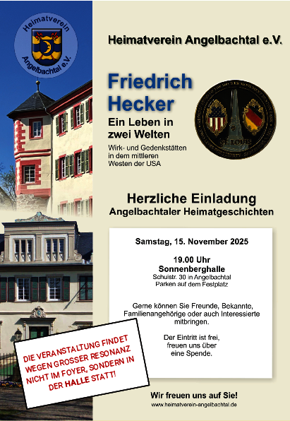 Lassen Sie sich mitnehmen auf eine eindrucksvolle Reise zu den Wirk- und Gedenkstätten Friedrichs Heckers in den mittleren Westen der USA. Mitglieder der Gemeinderatsdelegation werden uns in einem Reisebericht ihre Eindrücke und Impressionen präsentieren. Nach dem offiziellen Teil werden Sie Gelegenheit zum Austausch und zum Gespräch mit den Mitgliedern der Reisedelegation haben.
