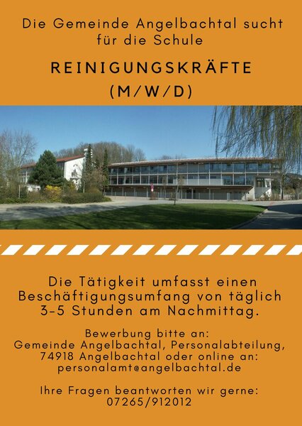 Die Gemeinde Angelbachtal sucht für die Schule mehrere REINIGUNGSKRÄFTE (m/w/d).